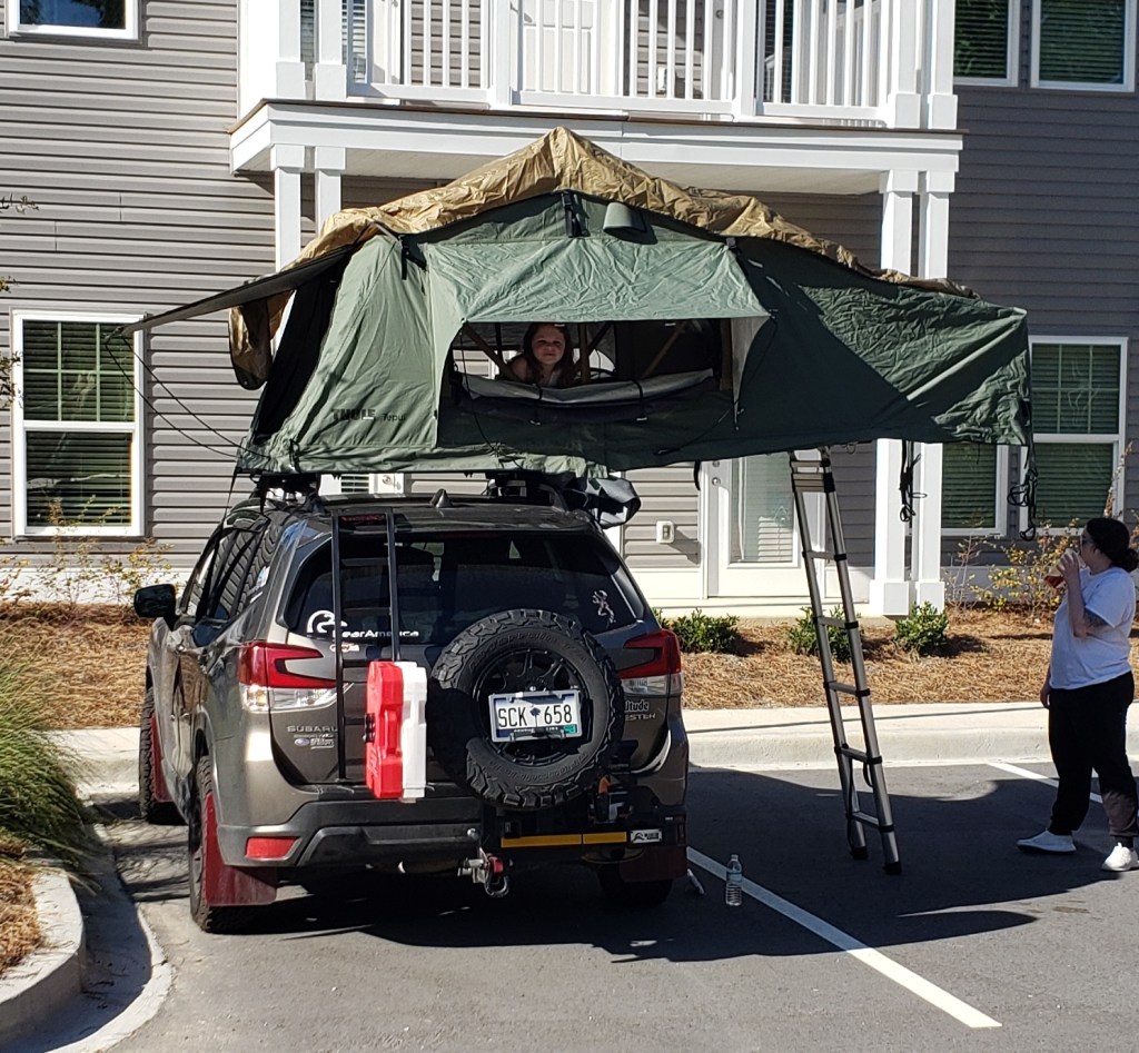 Not only have I retired, but the family home has been sold and my apartment emptied and packed away. I am now living a life somewhere between a hobo and vagabond . . . not certain which, but I actually look forward to fitting into either of these titles. I have had COLLINS PERFORMANCE of Summerville, SC, put a 2″ lift kit on my 2020 Subaru Forester, along with 17″ All Terrain tires and off-road rims, skid plates fore and aft, extra light tree on the front, swing out fifth tire on the rear. I have a THULE roof top tent, a NOMAD Kitchen built into the cargo area, and heavy-duty coils in the rear to support the added cargo weight.
