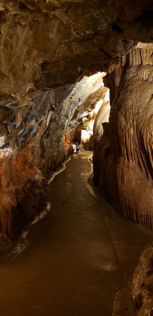 Over time, various entities fought in the courts for ownership of the caverns . . . and it probably fascinates some . . . but I just wanted to get underground! Digging into my wallet, I purchased my ticket (a bit more pricey than I expected at $29.00 for a Senior), and after running the gauntlet of cups, magnet, shirts, etc. that are sold in the Souvenir Store (that you have to go through going in and out of the caverns . . .what a marketing concept!!), I found myself walking down the long, covered serpentine entrance. Let me stop here for a second and explain . . . Luray Caverns is the fourth largest caverns system in the United States. As such it gets THRONGS of tourists every year. The parking lot is massive, there is a restaurant, toy store, antigue car exhibit, rope climbing area for kids, fudge shop, etc. Across the access road is a collection of 1800 era buildings in a farm setting to tour. It reminded me of an amusement park than the entrance to a cavern.