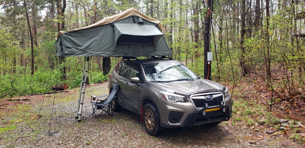 I cannot see what is surging towards me, I can only listen at it advances. The wind’s approach sounds much like an ocean wave rising to meet the beach, building as it approaches, louder and stronger as it draws nearer . . . the tent will start to flex and the car will start to sway as the crest arrives . . . only to rush past in a flurry of noise, then slowly subsiding as it spends itself higher up the valley, like surf crashing on the rocks and sand. As soon as one gust passes, another starts, sometimes stronger and I hold on waiting for the crest, or sometimes it is just a gentle rustle of the leaves surrounding me. We often rely on all of our senses to tell us the full story of the world around us. It is different to simply sit and let my ears attempt to sort out what is happening beyond the thin nylon walls of my rooftop cave. It is sometimes scary but it is also good to feel alive.