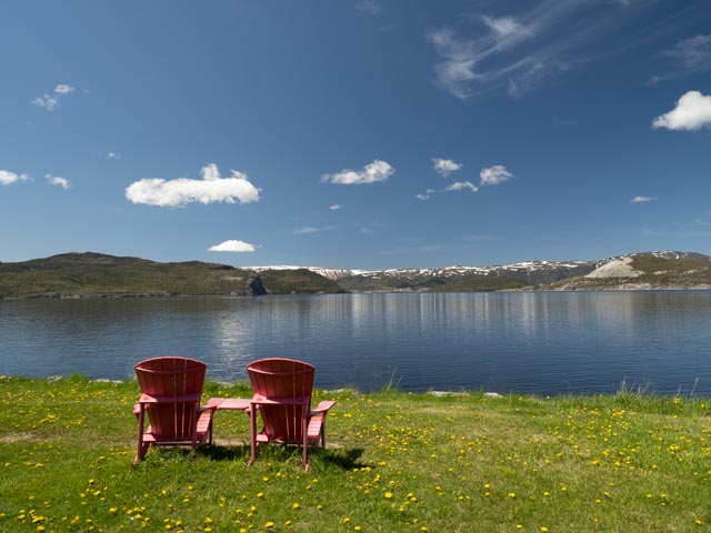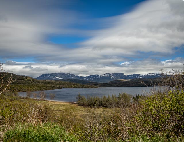You’ll remember this photo as I arrived . . . . . . but this is the exact same overlook yesterday in the clear sky and sun. I never even saw the fishing village on the far side of the fjord originally.I love these seats! They becon me to come sit, relax, and enjoy, and on a day like yesterday, it was so easy to partake of the glorious sun!Gros Morne National Park and one of the numerous glacier carved lakes.Every nook and cranny, small or large, along the coast is occupied by a fishing village, most that up until 1967, when the TCH was completed, were connected only by dirt tracks and coastal ferries. Shown in the distance in the village of Lobster Cove, Newfoundland.Lobster Cove Lighthouse, Lobster Cove, Newfoundland. This is a wonderful museum, but you cannot go up to the light. The light is property of the Canadian Coast Guard and still serevs to protect fishing and vessel traffic on the St. Lawrence Seaway.Looking south across the mouth of the bay to Lobster Cove. The banks below are exposed at low tide, here a change of almost 12 feet.The banks that extend out to the sea. These are hazards that historically have chewed up so many vessels, and why the coast of Newfoundland is dotted with hundreds of lighthouses.Night finally comes, but very late! And the colors are fascinating!. . . and new snow continues to show up on the higher slopes with the morning light!Canadians really know how to build quality hiking trails. The boardwalks are meant to help conserve the flora and fauna from destruction and keep people on the proper path! The large rock face along the fjord is called SHAG ROCK.Loons visited near the cabin one morning. They have the most wonderful call, crisp and clear, that echoed across the lake. In my mind, when you hear their call, you always will think of Canada. I had the chance to sit and watch one of the local lobstermen work his pots. Each and every lobster that was caught was carefully measured and sorted.If the lobster was too small, it was simply given a toss, to return to the cold waters and grow some more.Here is mine . . . nice and big and tasty!!Small and large, the fishing villlages are around every turn in the road on the coast. This is actually a privately owned site. You can see all the business it has! The hill to the Right is Burtnt Hill, Home of Delbirt the Moose. I was advised to NOT go looking for Delbirt. He is a BAD Moose and has hospitalized two people in the past year. Delbirt’s days are numbered!!With the arrival of warm weather, all sorts of creatures are emerging to enjoy the spring harvest.The spruce trees are a feast for the squirrels. In 1767, when Captain Cook, the same British Captain that “discovered’ the Hawaiian Islands, charted the west coast of Newfoundland, his crew brewed a “Spruce Beer” from the local trees. The beer provided a much needed source of Vitamin “C” to help stave off scurvy! No one seems to make “Spruce Beer” anymore!!I went on a Bird Walk at the Campgrounds with three Ornitholigists who are part of the first Newfoundland Bird Count, that is occurring now across the island. The group I was with were able to identify, mostly by sound since song birds are small and hide very well, twenty-eight different species of birds. I saw three and photographed ONE! LOLI did find this little one under a Spruce Tree. I think he was actually taking a bath in the wet moss and debris below the tree.Yep . . . I will photograph ANYTHING! LOL This is definately a sign of the thaw in Newfoundland as the Bull Frogs all emerge from their winter homes in the earth!I almost stepped on this rather large and bulbous toady!Some of the songbirds here have the most incredible colors and plummage.It took me over an hour to keep whistling for this little bird to FINALLY fly up into a tree from the dense undergrowth. I guess it finally wanted to see what all the botherv was about. This songbird is only about three inches tall and was aggressively patrolling its patch of forest. Such beautiful colors . . . and look . . . my Subaru!!Also, with the coming of spring and the warmth of the sun, Dandelions are blooming EVERYWHERE along the edges of the fjords, harbors and lakes, so large and bright.Every stream is surging to the sea with the recent rains. I did find some moose tracks along this brook . . . so they are here . . . I just need to keep searching!If not the bright Dandelions, then the Marsh Marigold, bursting forth in every wetland, bring bright spring colors!!