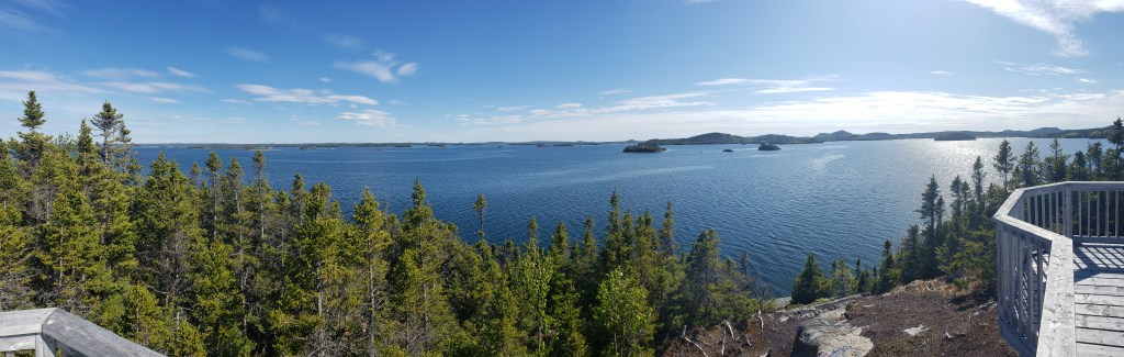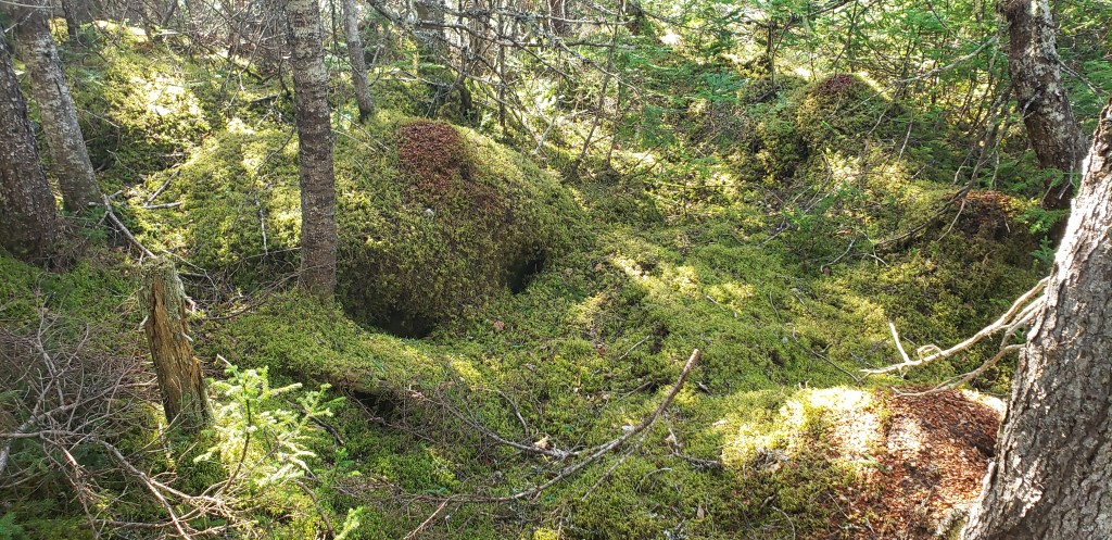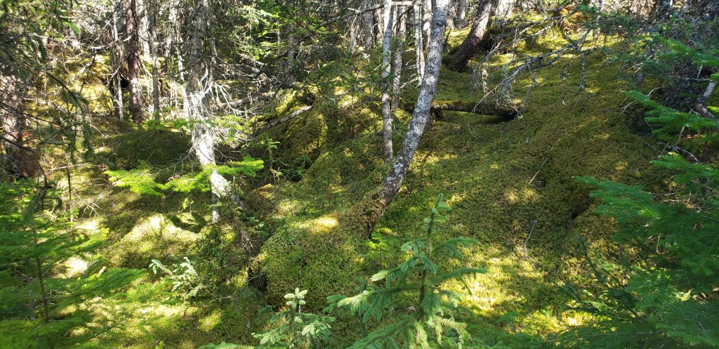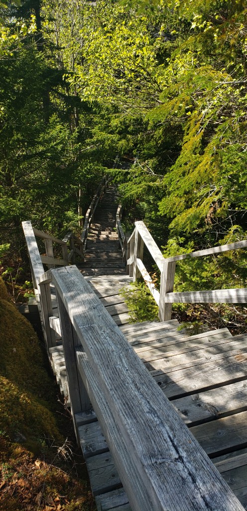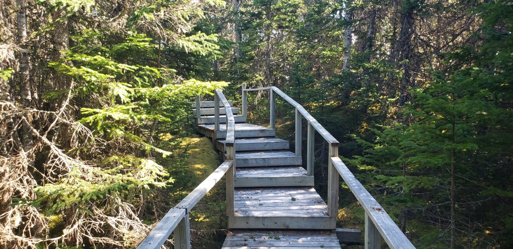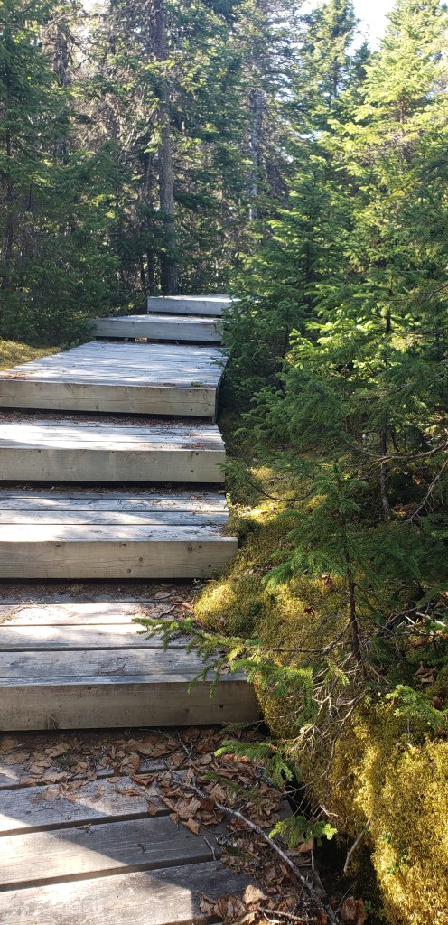 After setting up the tent and taking a nap (I LOVE NAPS almost as much as Ice Cream!!) I awoke to a bright break in the weather. One of the park rangers had told me about the ONLY hiking trail in Dildo Run (about 5 kilometers round trip) so I grabbed some water and headed out. The first 2 kilometers were a ratty, wet, muddy, root choked trail . . . that suddenly turned into these stairs.The stairs led down and up, up and down, through a thick and dark Arboreal Forest. The reason for the stairs and elevated walkway was to protect the forest floor which is a heavy and thick growth of moss and lichen.The forest floor growth has carpeted everything. I thought I saw it move once or twice, and even heard something scurrying around under it . . . and I decided not to put my hand on moss to test how thick it was . . . again “Rule #1!” I have seen that sci-fi movie where the moss eats the unsuspecting tourist!!and the trail just kept going . . . . . . and Going!!Abruptly the trail broke into the sunlight, onto an elevated platform, on top of a massive rock of limestone, overlooking what I was to learn are the “New World Islands” The entire archipeligo around Twilingate is actually a series of small islands, all connected by either causeways of ferries, into one large and active community. It is almost magical when you see it!!