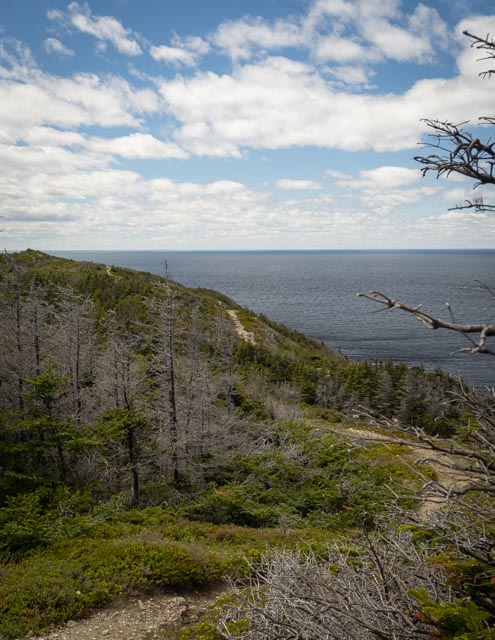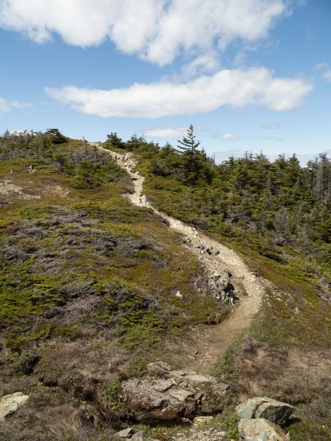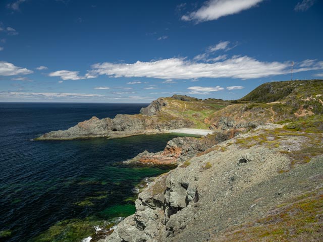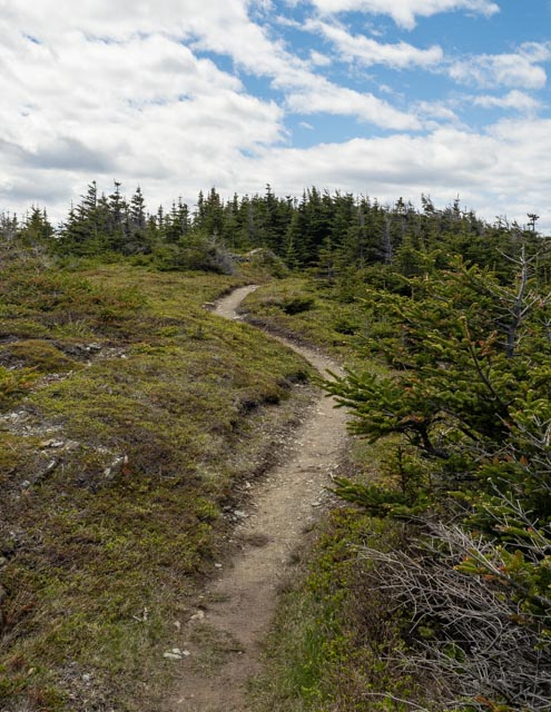 The 11th of June started beautifully. The sun was out and up, the little birds were singing and woke me at 4:50 AM (I want to kill them!!). I got dressed, made breakfast, packed everything up and headed back to Twilingate in hopes that maybe, just maybe, a new berg had drifted in from over the horizon. No such luck! LOL But . . . as you can see, the Lighthouse was much more photogenic in the sunshine! ( . . . and they still had more bubblegum ice cream!!)The surf along the coast had settled down significantly. This is the Canadian Coast Guard Bouy Tender from Twilingate going on patrol for 28 days. I know that because I spoke with one of the senior enlisted crewmembers earlier at Foodland! He told me that they periodically need to check navigational beacons for damage from passing icebergs. Sounds like fun!!I decided to go on another short 5 kilometer hike south of the lighthouse. The coast is just beautiful and the light was perfect. The trail runs along the edge of the cliffs, and as I was going up, people coming back down the trail kept telling me to not slip and fall to the right . . . it was a pretty long drop to the rocks!The view was magnificent!If you look close enough, you can still see my Subaru in the parking lot!The trail was very well defined, a narrow path through the peat moss and Heath growing on both sides.It was easy to see . . . fading into the distance! Did they say only 5 kilometers??Nothing in NEwfoundland is flat. It all seems to go up at angles meant for sheep . . . . . . or some meant for mountain goats!!Yet . . . the views truly are worth the effort!And at trails end you arrive at this wonderful overlook, gazing back at the south side of Twilingate. It was not until I stood here that I realized that Twilingate is actually sitting on and isthmus between two bays, north and south.long the trail I found a couple of new plants. This tiny budding plant is called Canadian Bunchberry. It grows in patches over the rocky ground, rotted into the peat. The buds are about the size of a dime.This plant grows up in small bushes, with clusters of these pink and green blossoms. This is Pink Mountain Heath.I had to get down on my knees and elbows for this shot. All four of these flowers would be covered by a nickle. They grow in individual spots along the trail . . . just a spot of gorgeous color scattered about. This is a Birds Eye Primrose.Finally, a panorama from the “Artist’s Cabin” (available for rental!!) along the backside of the trail. This is absolutely the perfect country for hiking!!And the day ended back at the lighthouse . . . just atad bit more than 5 kilometers! LOL My last real day in Newfoundland, and one of the best days so far!!