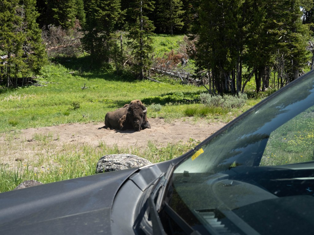 My personal favorite. This large adult male was in the herd at Custer State Park, Wyoming. He, and 188 other bison had decided to cross the road between two pastures and a stand of Pine Trees. It took them over an hour to finally let us humans continue down the road. At one point, I could have reached out my car window and patted this bull on the shoulder!There is a big difference in seeing one of these creatures in a paddock in a zoo versus seeing one in the wild. Somehow, I personally never truly appreciated just how big one of these animals really are.Jokingly, the Parks now sell signs and tee-shirts in the stores that state “Please do not pet the fuzzy cows!”, but people still think bison are placid, cow-like creatures. Sadly, two tourists have been gored by bison at Yellowstone now in the past two weeks while trying to get too close,This bull is massive, easily over 2,000 pounds of muscle, bone and fur, along with a very unpredictable temperament. Those horns only look small because the rest of the animal is so big!!This bison has a rider, as do many of them. Look on his back and you will see his small friend.This Cow Bird is helping groom the bison of fleas, ticks and other insects that take up residence in the thick fur of the buffalo.I met this bull quite by chance. I had pulled off the road to walk back and take a picture of a series of hot springs near the Lake at Yellowstone. I was not even aware he was there until he stepped out of the trees approximately 25 feet from me. He stopped . . . I stopped . . . and I backed away very carefully, all the while being watched closely by him. He opted to leave me alone and wandered to a wallow close by instead of tap dancing on me!This is how I took the previous photo, by carefully observing the actions of the buffalo from the far side of my car. The buffalo was not feeling threatened, and I was able to safely enjoy watching him.They do kind of look like “fluffy cows”! You cannot have big bison without first having little bison. Herds are all carefully managed within the various parks to ensure the species stays healthy and within a manageable size. I did not know that when meat was being rationed during World War Two, the herd of bison at Custer State Park was used to provide meat to people around the United States.Bison calves stay very close to their mothers . . . and getting between a mother and her offspring would probably not be a good thing.I found this young bull while driving to Custer State Park. He was the only bison in a huge section of rolling grassland, I caught a glimpse of him at the bottom of a rising hill. Thinking I would be safe if I approached him from up-hill and up-wind, I parked and walked to the top of the ridge line. As soon as he saw me . . . we made eye contact . . . and he started up the hill . . . . . . only to approach a few yards closer and then rudely do this!!! LOL Like I said, bison behavior is quite unpredictable!
