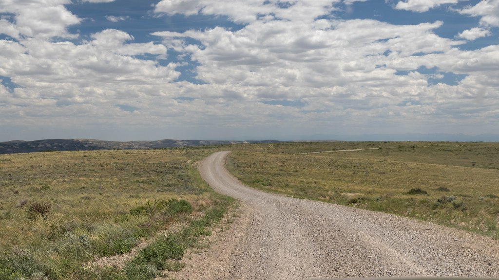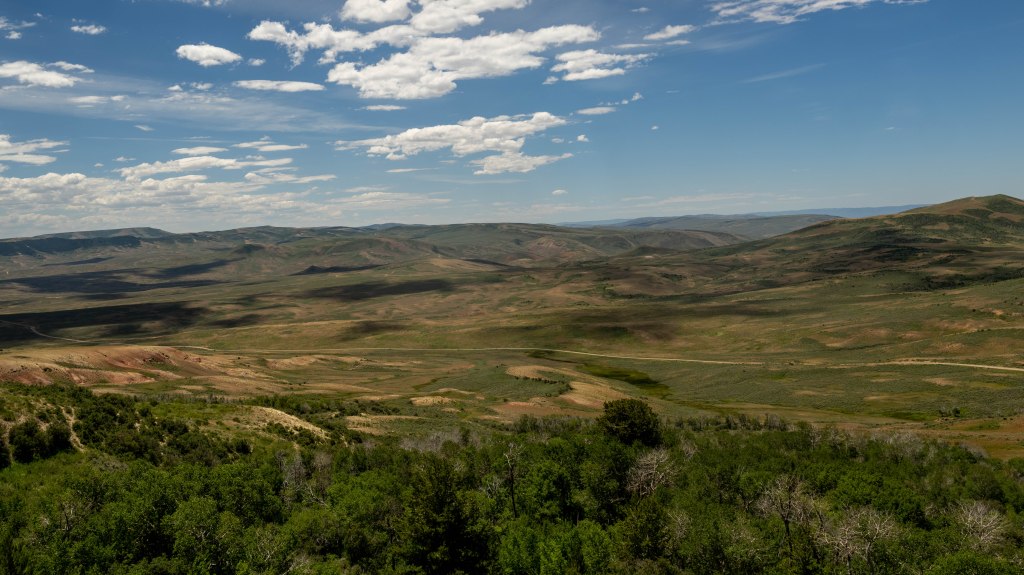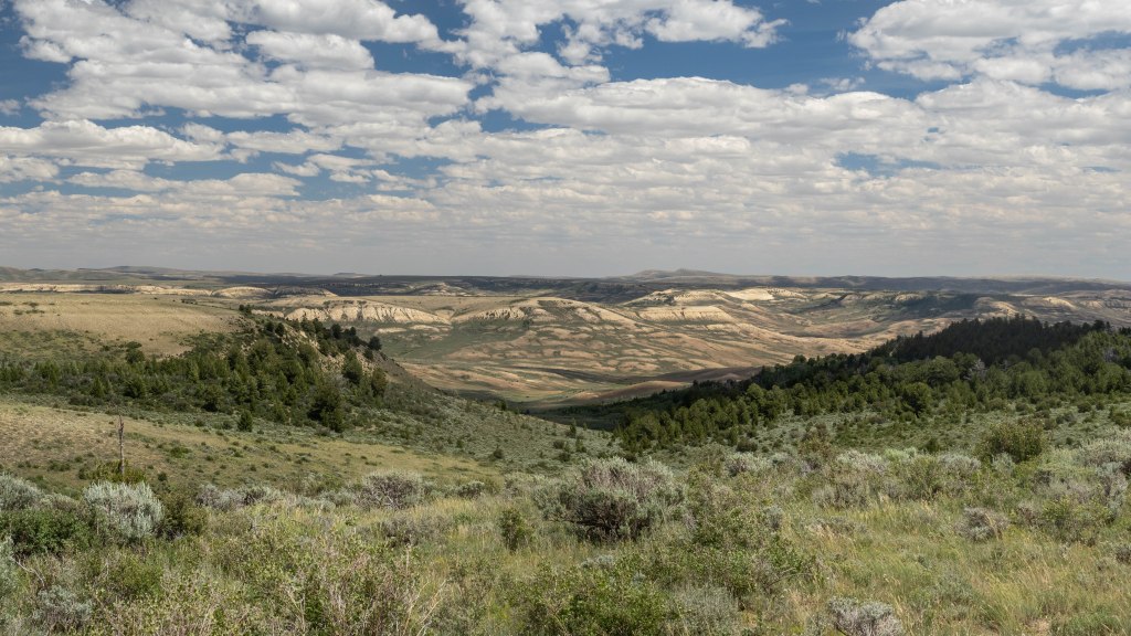 Hard to imagine there is a ‘butte” out here anywhere. This is the land of Pronghorns, natural gas wells and tumbleweeds.Slowly, as you climb in elevation, the scenery changes. This is the look from the fossil beds out over the surrounding acreage.