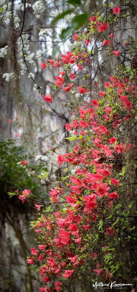 Red Azaleas form a cascade along a trail through the Magnolia Planation Gardens