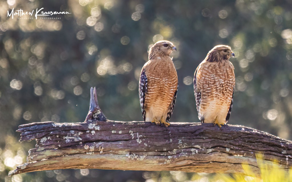 Morning light on a pair of young, Red-Shouldered Hawks. I was watching them for over an hour and could hear the adults calling to them from the woods. These two must have just recently fledged and the adults were teaching them flying and hunting. The kids were obviously not in on the game!!