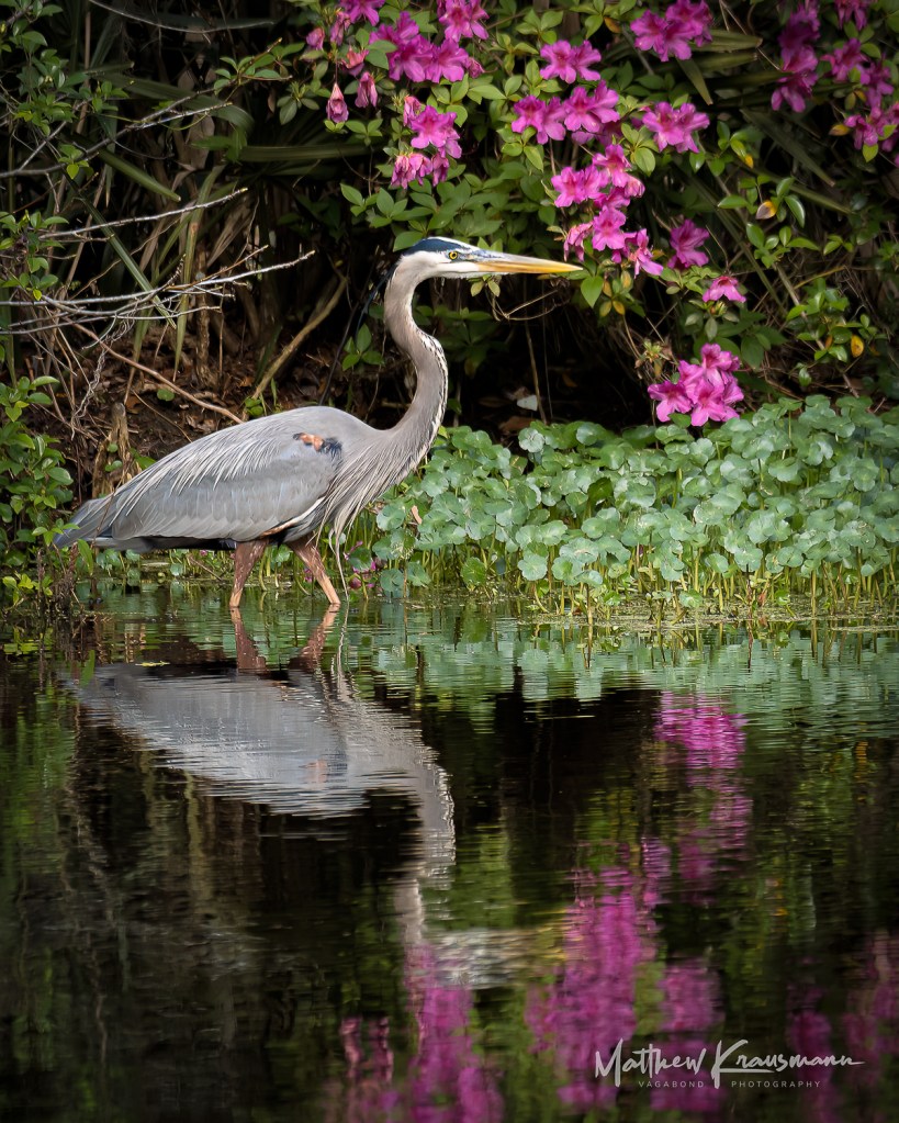 Easily my favorite photograph so far for 2023! I had seen this Great Blue Heron feeding along this shoreline for a few mornings. The Azaleas were just looking better and better, so when I saw he bird on the shore this time I opted to just slowly follow its progress, knowing that sooner or later it would cross this spot. I love it when a plan comes together! LOL