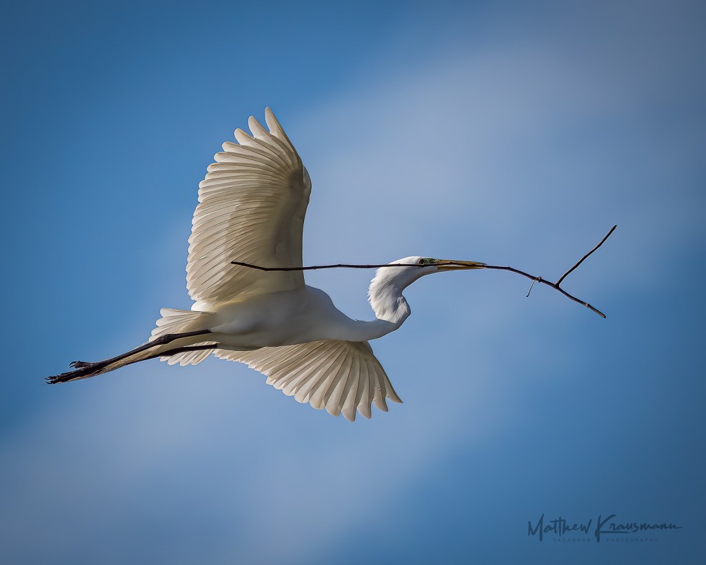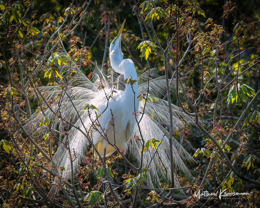 It is mating and nesting season now in the south. A Great Egret performs his mating display and dance, courting the female close by as they build this season’s nest.
