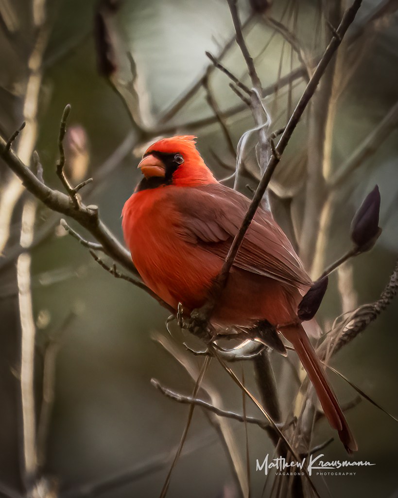 A Northern Cardinal, all puffed up to retain warmth, on a cold winter morning.