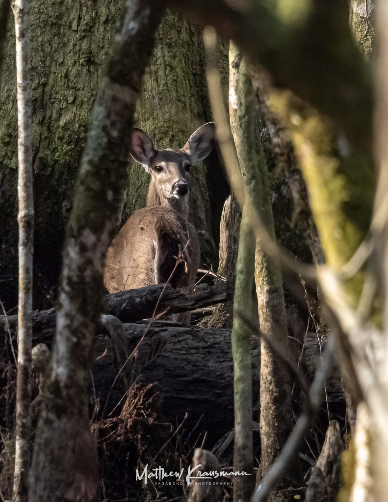 The does will be dropping fawns soon, and I love seeing the new kids in the swamp. This one was on her own and very skittish of the human with the one big eye!