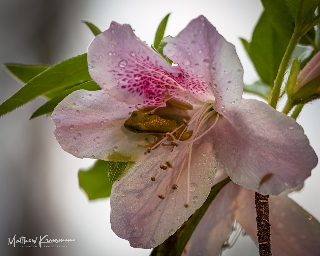 A green Tree Frog seeks shelter from a rain shower inside a pale pink Azalea blossom.