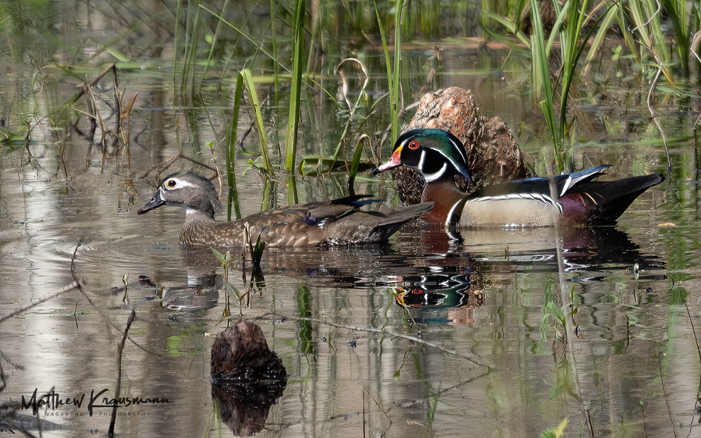 A mated pair of Wood Ducks. Usually very hard to get good pictures of since as soon as they hear anything unusual, they jump into flight. This pair has been on the lake for the past month and seems to be becoming more tolerant of humans with cameras.