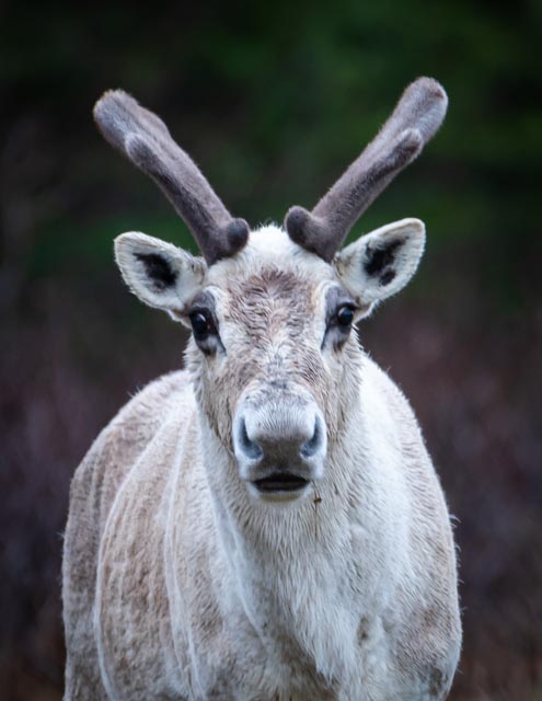 Darn Flash! Hard to get a good photo in the near dark with moving mountains of fur without it though! I believe the bigger of the three on the right is a pregnant female, and calfing season should be starting soon!Of the nineteen moose I saw today, this one is showing the side I saw the most of . . . the back side! LOL Moose are, as I found out this morning, very cagy and even though they seem to like standing on the sides of roads, they do not like headlights or cars. They will usually move rapidly for cover when approached. Even if you approach them slowly, they still head for the hills when a car door opens. I was lucky with these six. I WILL keep looking for more!!I loved this Caribou!! It was the only one today that did not seem to be instantly terrified when my car approached. It was munching grass, and only seemed interested in continuing to munch grass, even as I parked, exited my car and cautiously approached to take this photo . . . but I could not get it to look up. I tried calling it (don’t ask!), I clapped my hands, I even whistled at it . . . munch, munch, munch . . . nothing! But then, when I turned to walk away . . . it looked up!! Ha . . . got it!! Silly Caribou!!